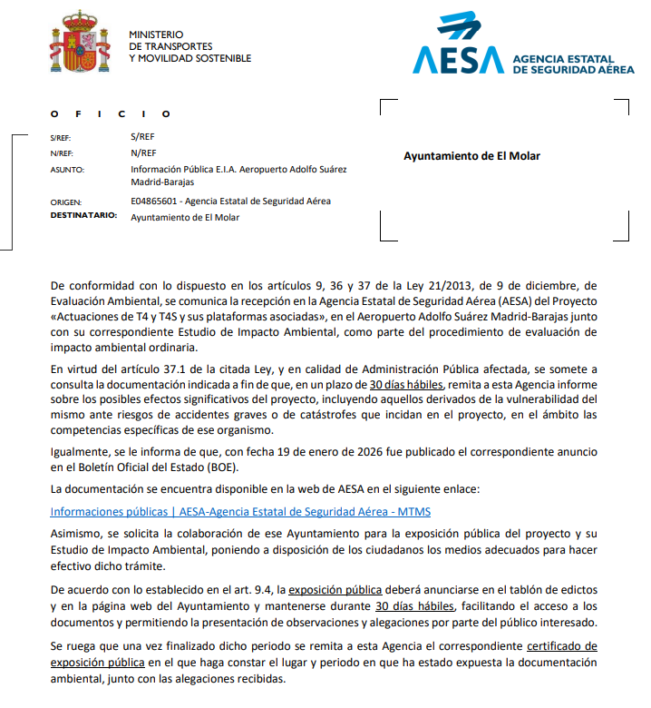 Aeropuerto Adolfo Suárez Madrid-Barajas Se informa a la ciudadanía de que, en el marco del procedimiento de evaluación de impacto ambiental ordinaria, y de conformidad con lo dispuesto en los artículos 9, 36 y 37 de la Ley 21/2013, de 9 de diciembre, de Evaluación Ambiental, se ha recibido en este Ayuntamiento la documentación relativa […]