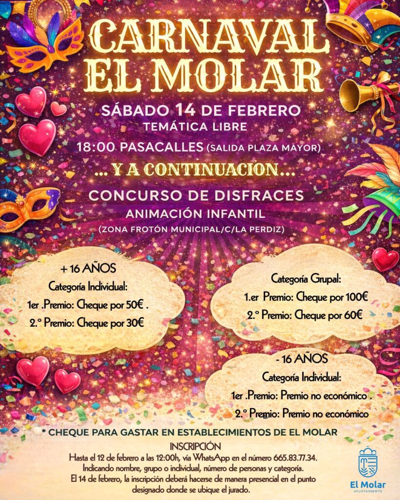 El sábado 14 de febrero celebramos el Carnaval de El Molar con una jornada llena de color, música y diversión para todas las edades. La temática es libre, así que deja volar tu imaginación y ven a disfrutar disfrazado. 🎉 Programa 🕕 18:00 h – Pasacalles (salida desde la Plaza Mayor) ➡️ A continuación: 🎭 […]