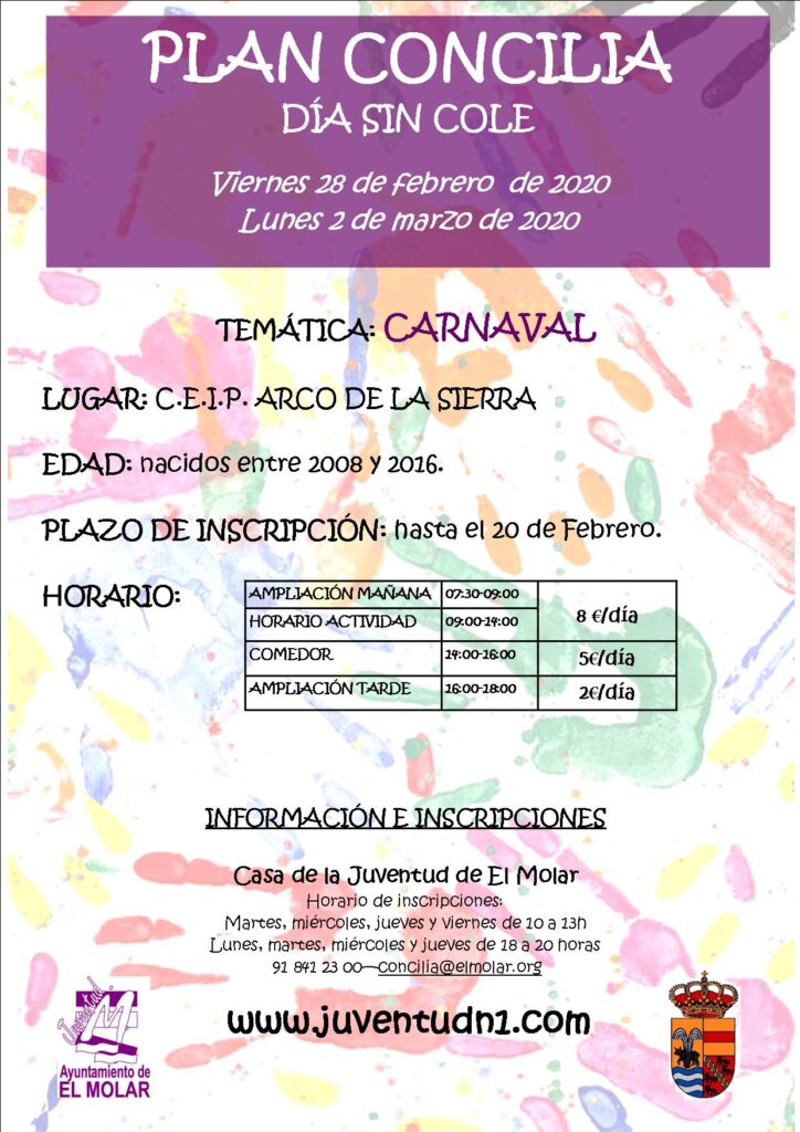 El viernes 28 de febrero y el lunes 2 de marzo, como cada día no lectivo y no festivo, el Plan Concilia organiza los días sin cole, con temática “Carnaval”, dirigido a menores que cursan educación infantil y primaria (nacidos entre 2008 y 2016).