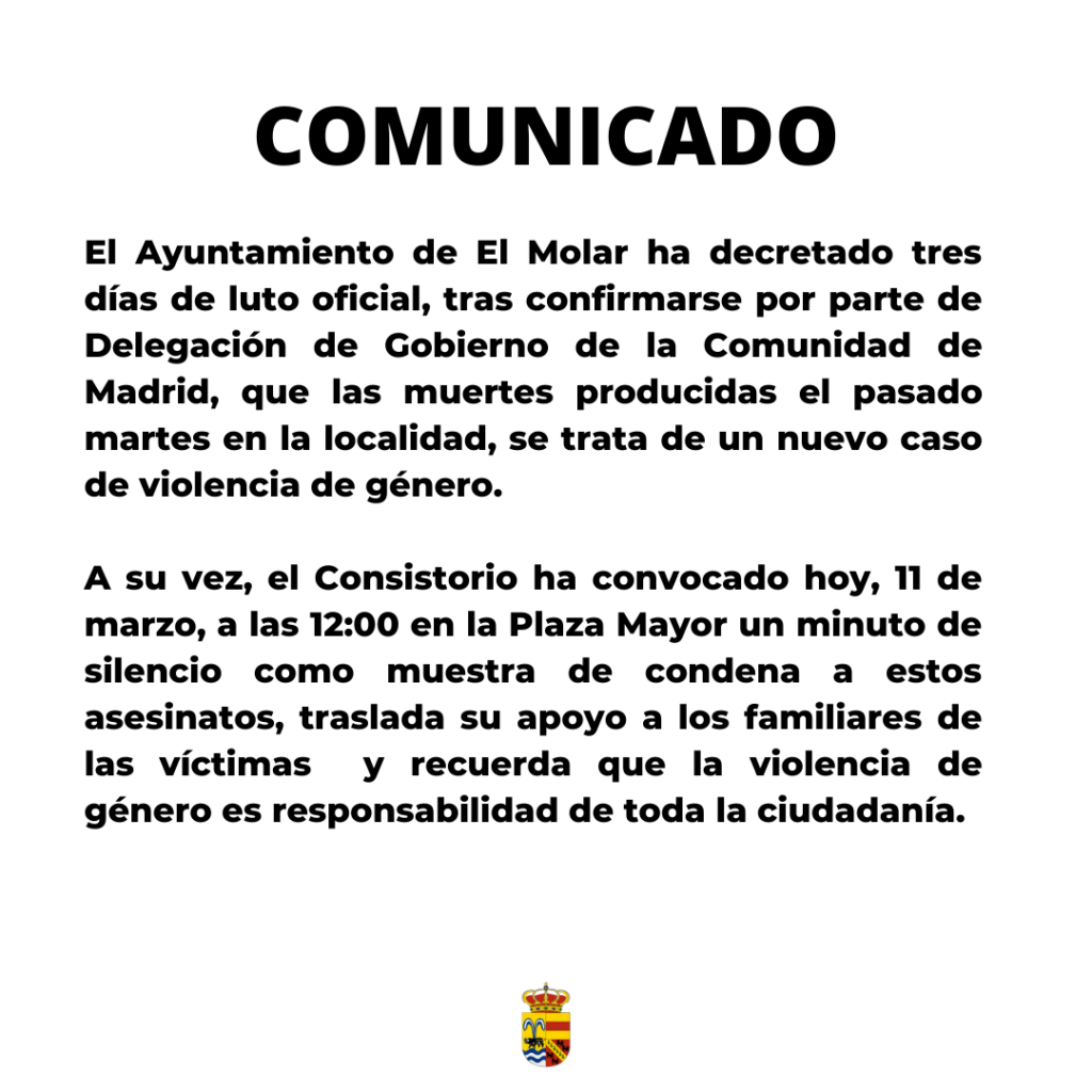 El Ayuntamiento de El Molar ha decretado tres días de luto oficial, tras confirmarse por parte de Delegación de Gobierno de la Comunidad de Madrid, que las muertes producidas el pasado martes en la localidad, se trata de un nuevo caso de violencia de género.