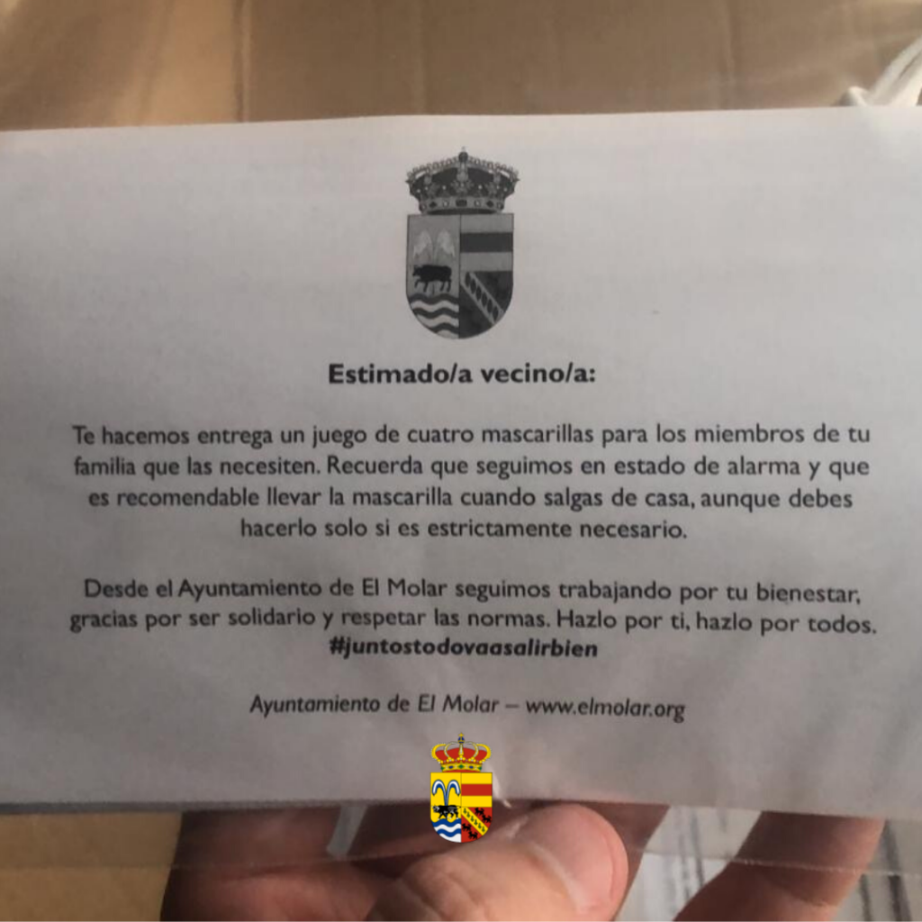 Con el inicio de la fase 1 de la desescalada, con el objetivo de garantizar la seguridad de los ciudadanos y minimizar los riesgos de propagación de la pandemia, el Ayuntamiento de El Molar ha empezado a a distribuir mascarillas, en paquetes de cuatro unidades, a los vecinos del municipio.