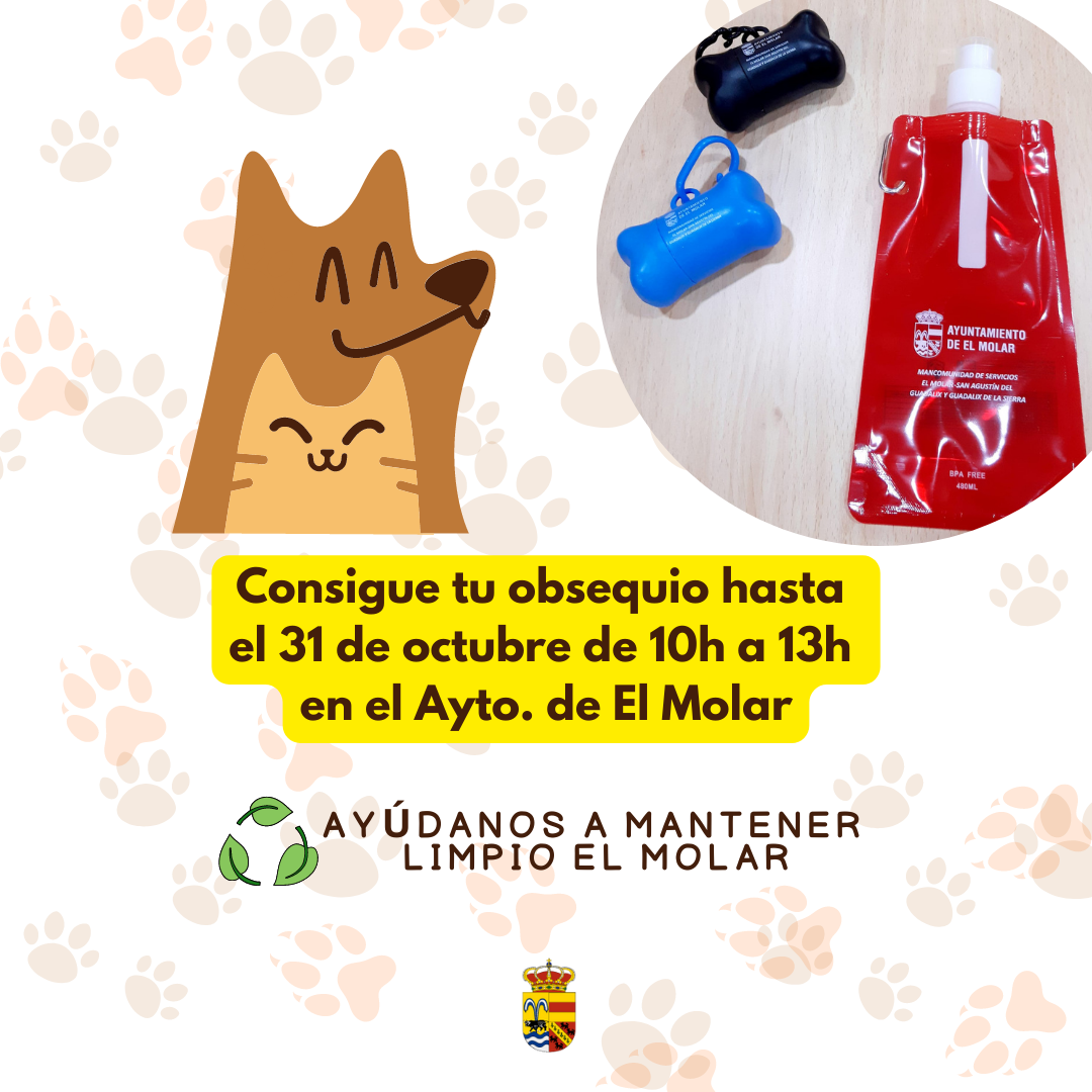 Con motivo del Día Internacional de los Animales, celebrado el pasado 4 de octubre, el Ayuntamiento de El Molar distribuye botellas plegables de plástico  y portabolsas para facilitar que los dueños de perros puedan limpiar el pipí y recoger los excrementos de sus mascotas.