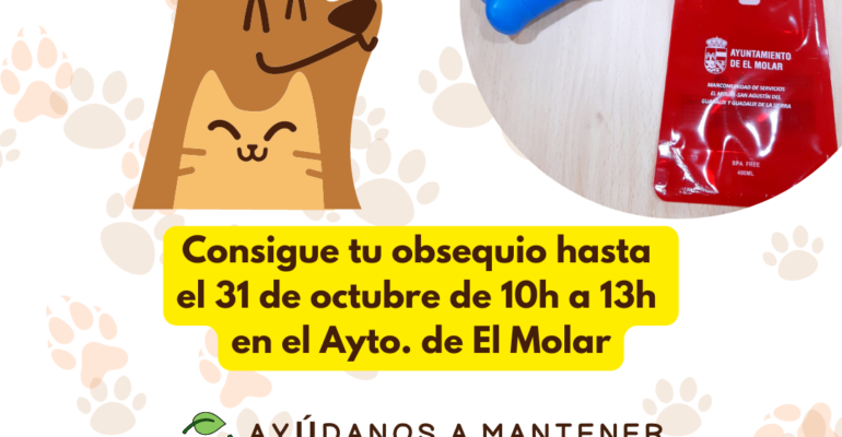 La entrega de botellas y portabolsas se hará hasta el 31 de octubre de 10h a 13h en el Ayuntamiento de El Molar. Para ello será necesario tener a las mascotas registradas en el censo municipal, lo que además esta acción permite actualizar el censo municipal de perros y gatos y animar a aquellos propietarios que no tengan censados sus animales a regístralos en el censo. Para realizar la inscripción en el censo, deberán aportar el dni del propietario y la cartilla del animal.