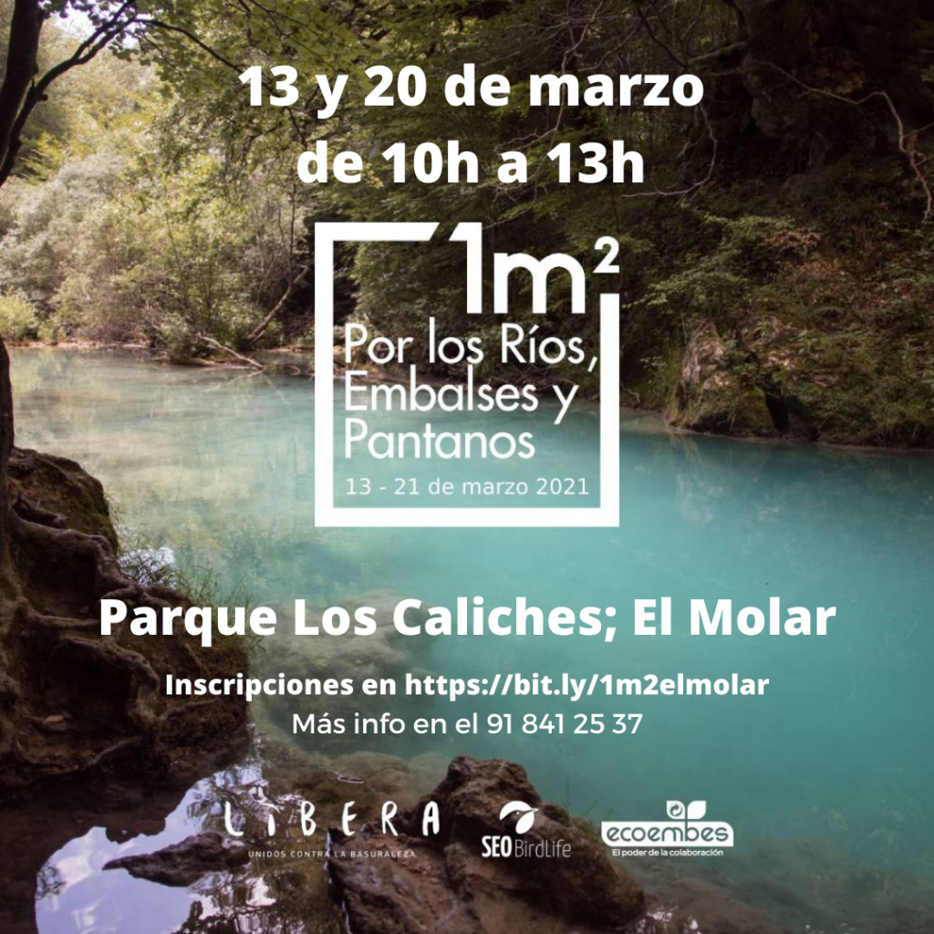 Con motivo del día de los ríos, 14 de marzo, y de la llegada de la Primavera, el Ayuntamiento de El Molar ha organizado dos jornadas de recogida de Basuraleza, los días 13 y 20 de marzo de 10h a 13h en la zona de “Los Caliches”. Estas jornadas forman parte de la iniciativa Libera 1m2 por los Ríos, Embalses y Pantanos, del Proyecto Libera, al que el Consistorio se unió en julio de 2020, adquiriendo un compromiso que pretende sensibilizar y concienciar a vecinos y visitantes frente al abandono de escombros y residuos, y actuando como parte activa en la transmisión de los mensajes de las campañas de sensibilización disponibles.