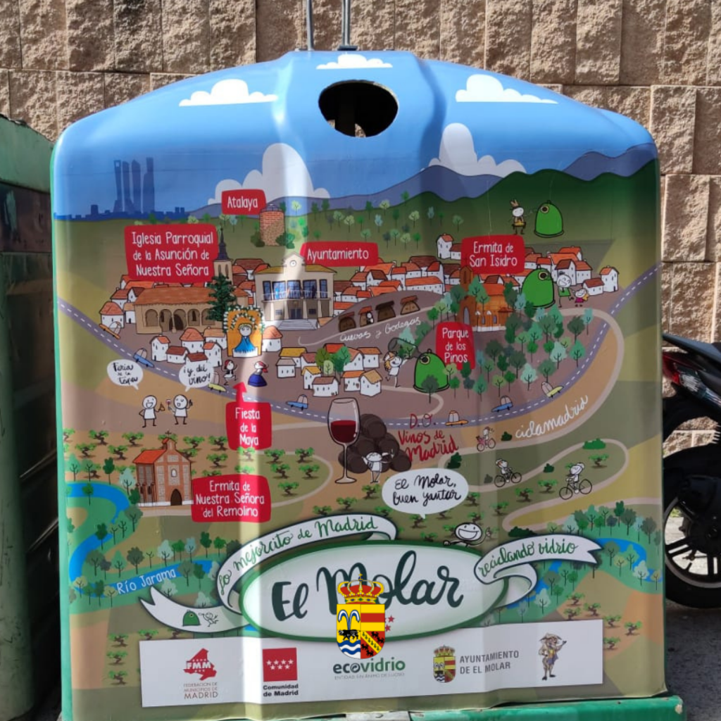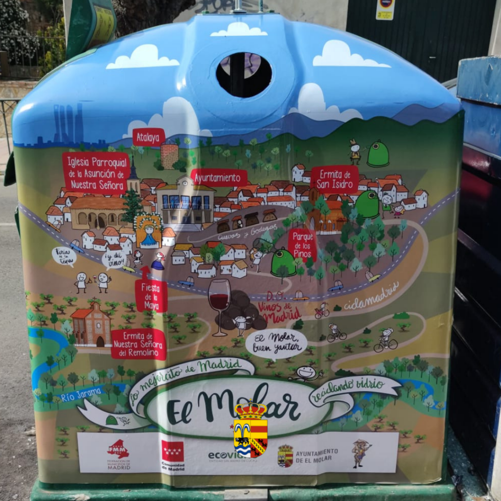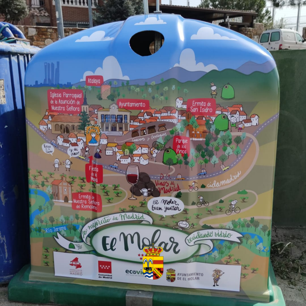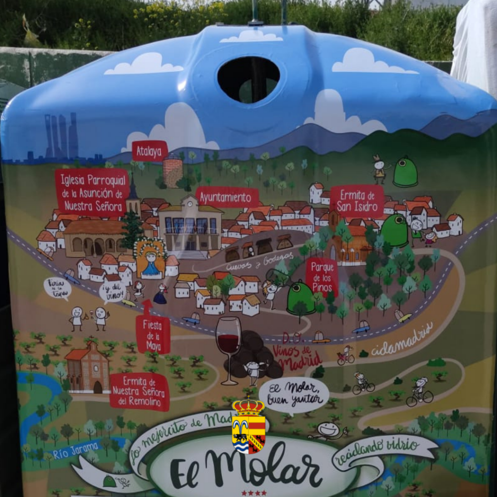 Tras superar el Reto Mapamundi el pasado mes de enero, donde se aumentó en un 10% el vidrio reciclado en noviembre y diciembre de 2020 respecto al año anterior, el municipio de El Molar ya posee sus diez contenedores vinilados con ilustraciones del municipio como premio.