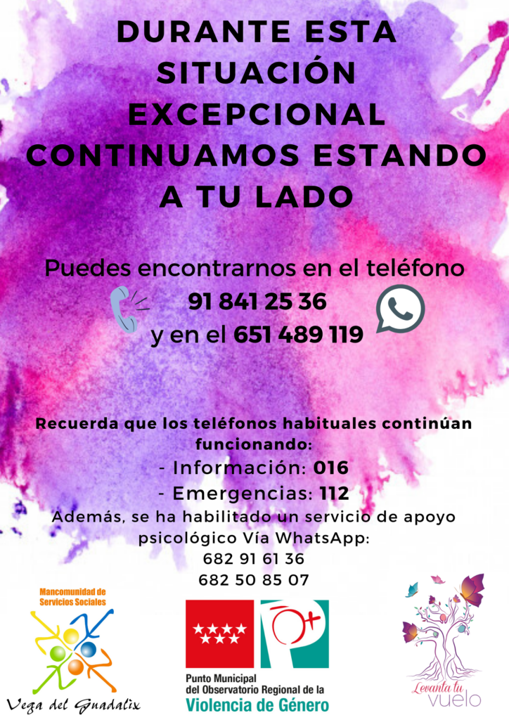En caso de necesitar información, acompañamiento o apoyo, contactar con los teléfonos que aparecen a continuación. Recordamos que también continúan funcionando los teléfonos de asistencia habituales: 016 y 112