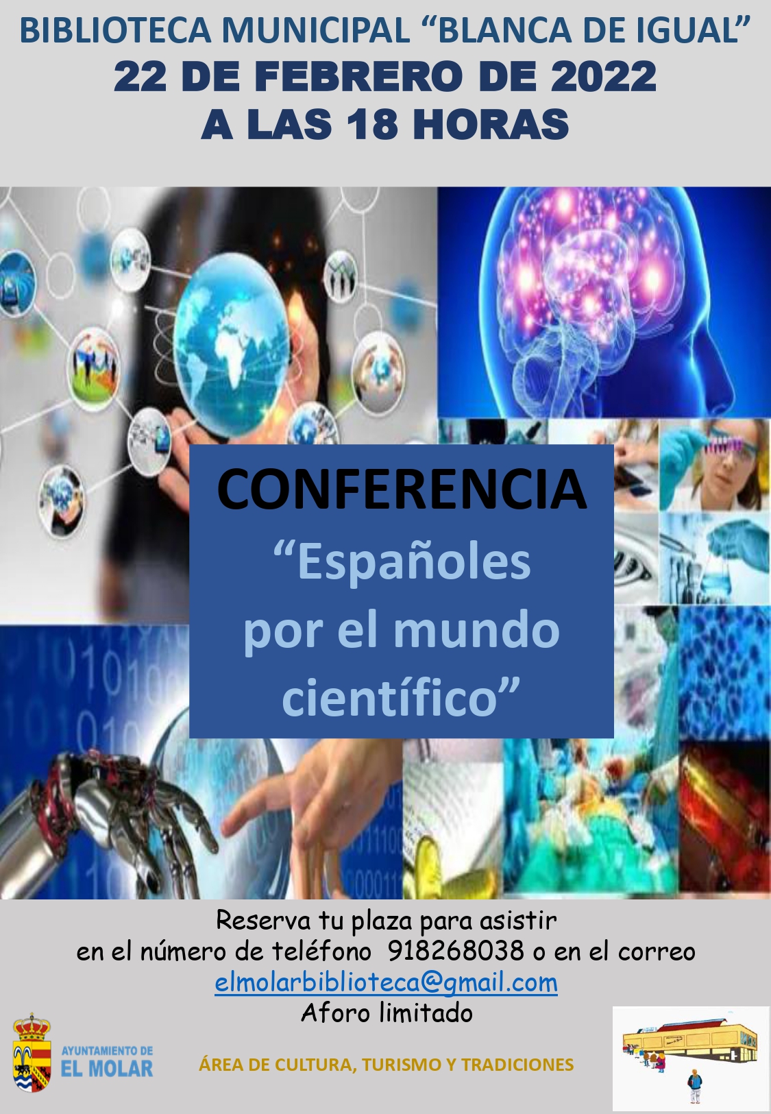 - 22 de febrero a las 18:00 – Conferencia “Españoles por el mundo científico”, por Javier Díaz Gómez, profesor del Instituto Alto Jarama de Torrelaguna. Dirigido a público juvenil (mayores de 12 años) y adultos. Aforo limitado (25 personas). Reserva tu plaza para asistir en el número de teléfono 918268038 o en el correo elmolarbiblioteca@gmail.com
