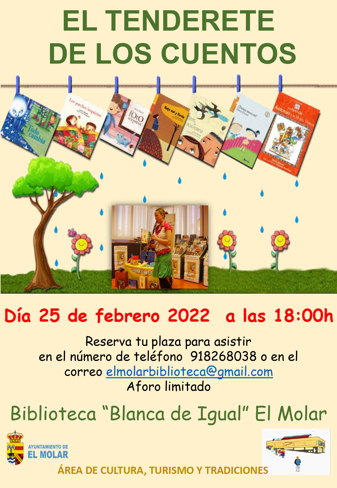 - 25 de febrero a las 18:00 – Cuentacuentos “El tenderete de los cuentos”, dirigido a menores con edades comprendidas entre 4 y 10 años. Aforo limitado (20 menores acompañados de 1 adulto). Reserva tu plaza para asistir en el número de teléfono 918268038 o en el correo elmolarbiblioteca@gmail.com