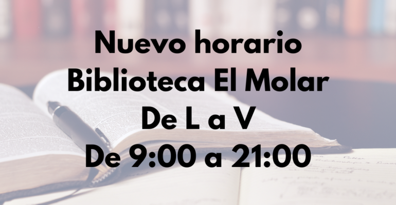 La Biblioteca de El Molar amplía el horario de apertura. Desde este lunes, estará abierta de lunes a viernes en horario ininterrumpido desde las 9:00 hasta las 21:00.