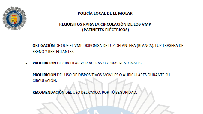 La Policía Local informa de las condiciones obligatorias para circular con vehículos de movilidad personal (VMP):