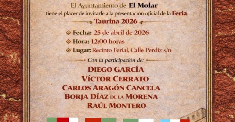 El Ayuntamiento de El Molar invita a vecinos y visitantes a asistir a la presentación oficial de la Feria Taurina 2026, un acto que marcará el inicio de una de las citas más destacadas del calendario festivo del municipio.