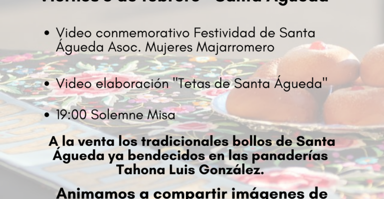 Desde el Área de Cultura, Turismo y Tradiciones, queremos que las fiestas tradicionales de El Molar se mantengan vivas a pesar de las circunstancias. Por ello, en colaboración con la Cofradía de Santa Águeda y la Asociación de Mujeres Majarromero, presentamos un programa de actos con el queremos conservar y reforzar nuestra identidad cultural, para que la esencia de festividades como Santa Águeda, prevalezca en nuestra memoria y perdure con el paso del tiempo.